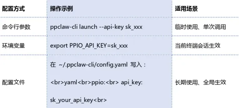 使用 PPClaw CLI 需先配置 PPIO 平台的 API Key(获取地址),支持三种配置方式(优先级从高到低):